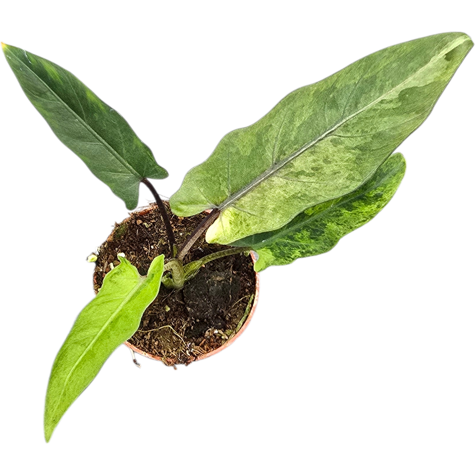 Een opvallende en zeldzame Alocasia met lange, smalle bladeren die sierlijk omhoog groeien en zijn voorzien van crème-witte tot lichtgele variegatie. De combinatie van het slanke blad en het sterke kleurcontrast geeft de plant een elegante, exotische uitstraling. Groeit het best in helder, indirect licht, met hoge luchtvochtigheid en een luchtige, licht vochtige potgrond.