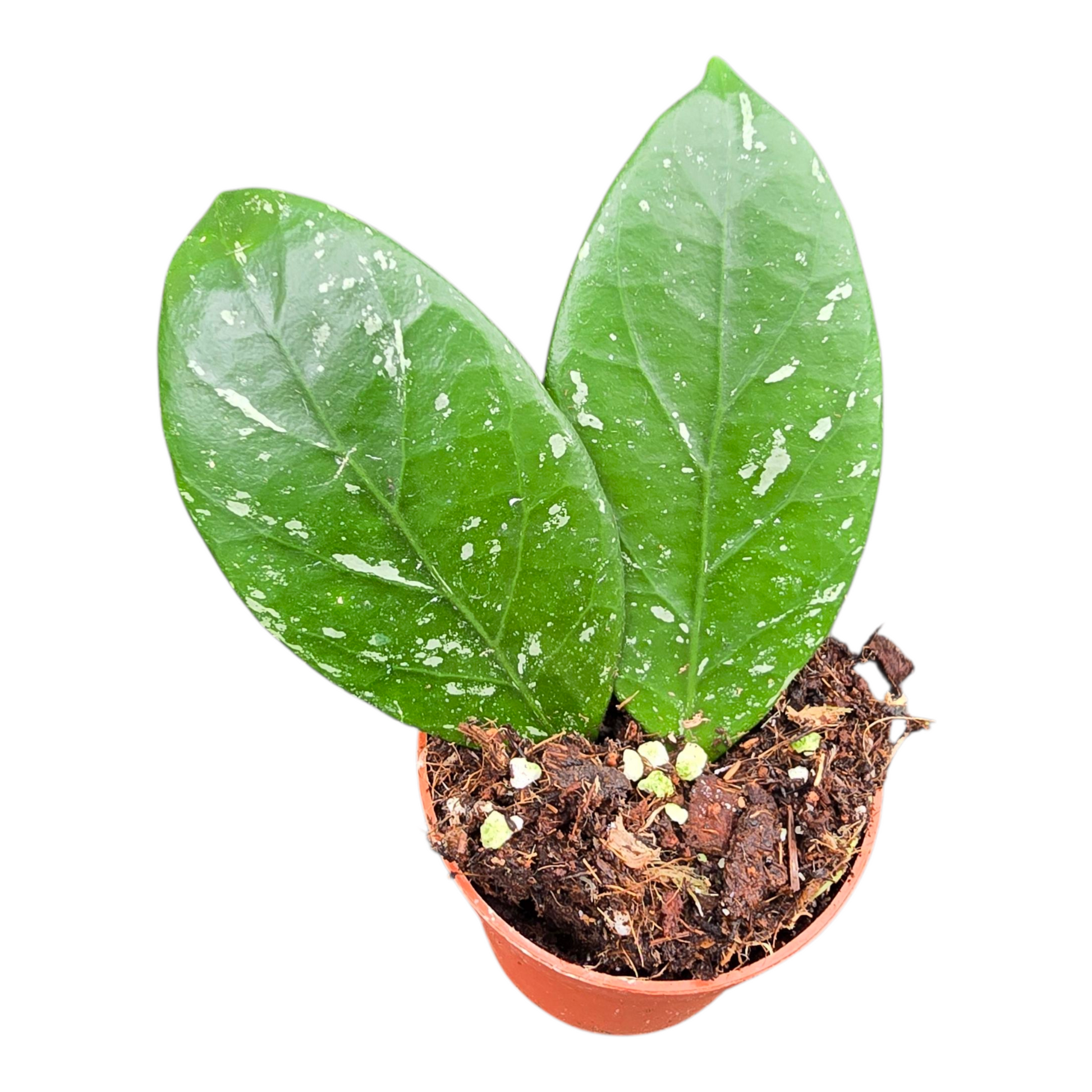 Een opvallende Hoya uit Vietnam met glanzende, olijfgroene bladeren die worden versierd met zilver‑witte ‘splash’-vlekken. Deze klimmer of hangplant groeit elegant langs een mosstok of in een hangmand en vraagt helder, indirect licht, goed-drainerende potgrond, matige watergift en een warme, vochtige omgeving. Perfect voor verzamelaars die een unieke, onderhoudsvriendelijke eyecatcher zoeken.