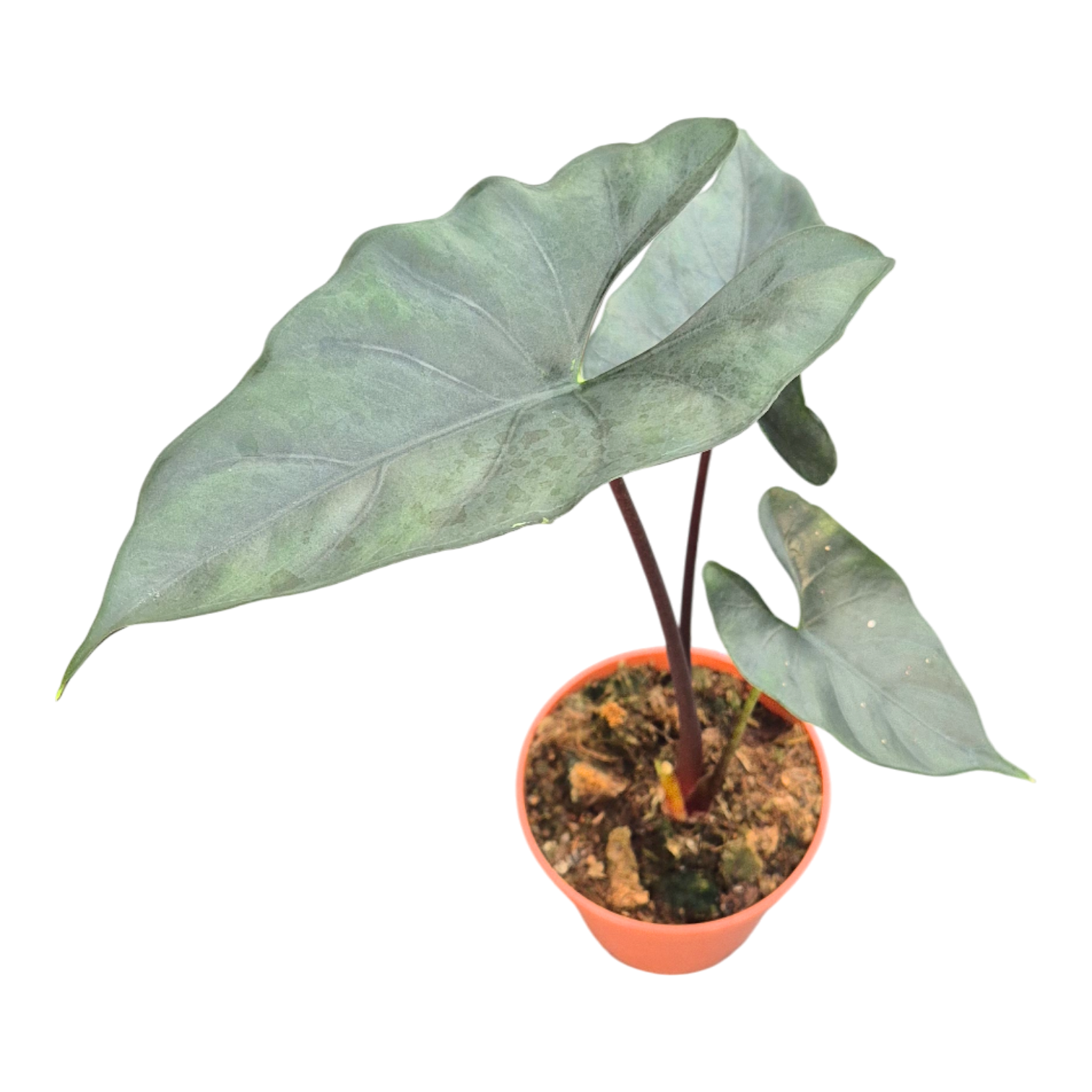 Een spectaculaire Alocasia met diep paarse tot bijna zwarte bladeren en stevige nerven, wat de plant een dramatische en mysterieuze uitstraling geeft. Compact en elegant, groeit het best in helder, indirect licht, met luchtige, goed-drainerende potgrond en hoge luchtvochtigheid, waardoor hij een echte blikvanger is voor verzamelaars.