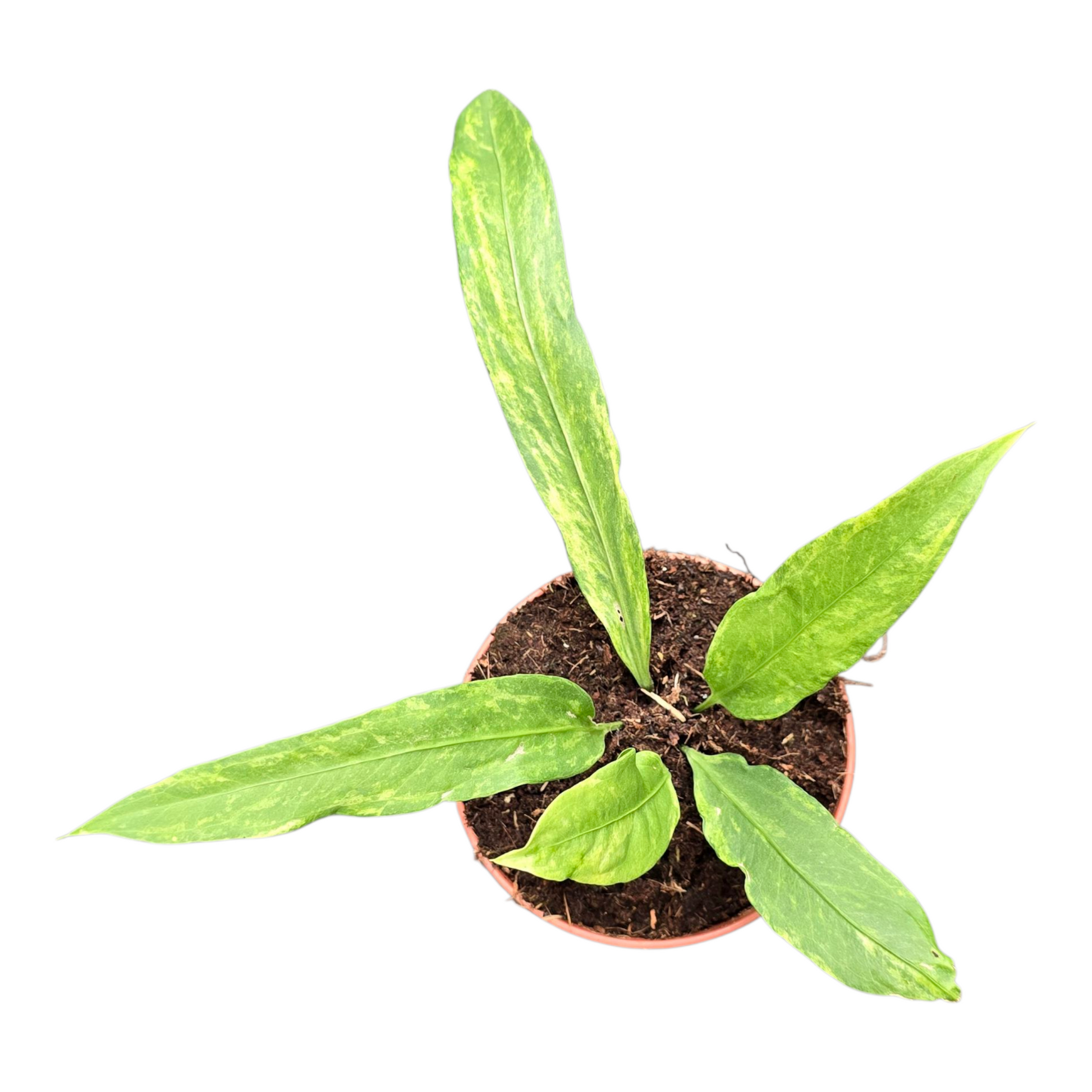 De Anthurium Vittarifolium Variegata is een uitzonderlijke en zeldzame plant die een echt statement maakt in je interieur. Deze variëteit van de populaire Anthurium Vittarifolium valt op door zijn unieke variegatie, met mooie vlekken van wit en lichtgroen die de bladeren een betoverende uitstraling geven. Deze tropische schoonheid is een must-have voor elke plantenverzamelaar die op zoek is naar iets exclusiefs en unieks.